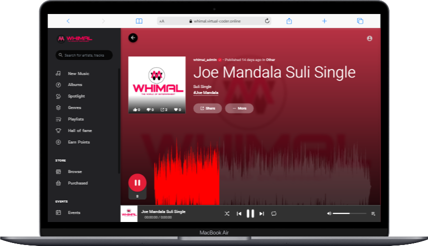 Whimal (formerly Groove Music), led by Mr. Garnet Chelenga, envisioned a platform to celebrate and promote Malawi's diverse musical heritage. The goal was to create a scalable, user-friendly music streaming service that not only catered to listeners but also empowered artists to showcase their work. VirtualCoder brought this vision to life by developing a feature-rich, intuitive platform that supports personalized user experiences, artist management tools, and seamless streaming capabilities.